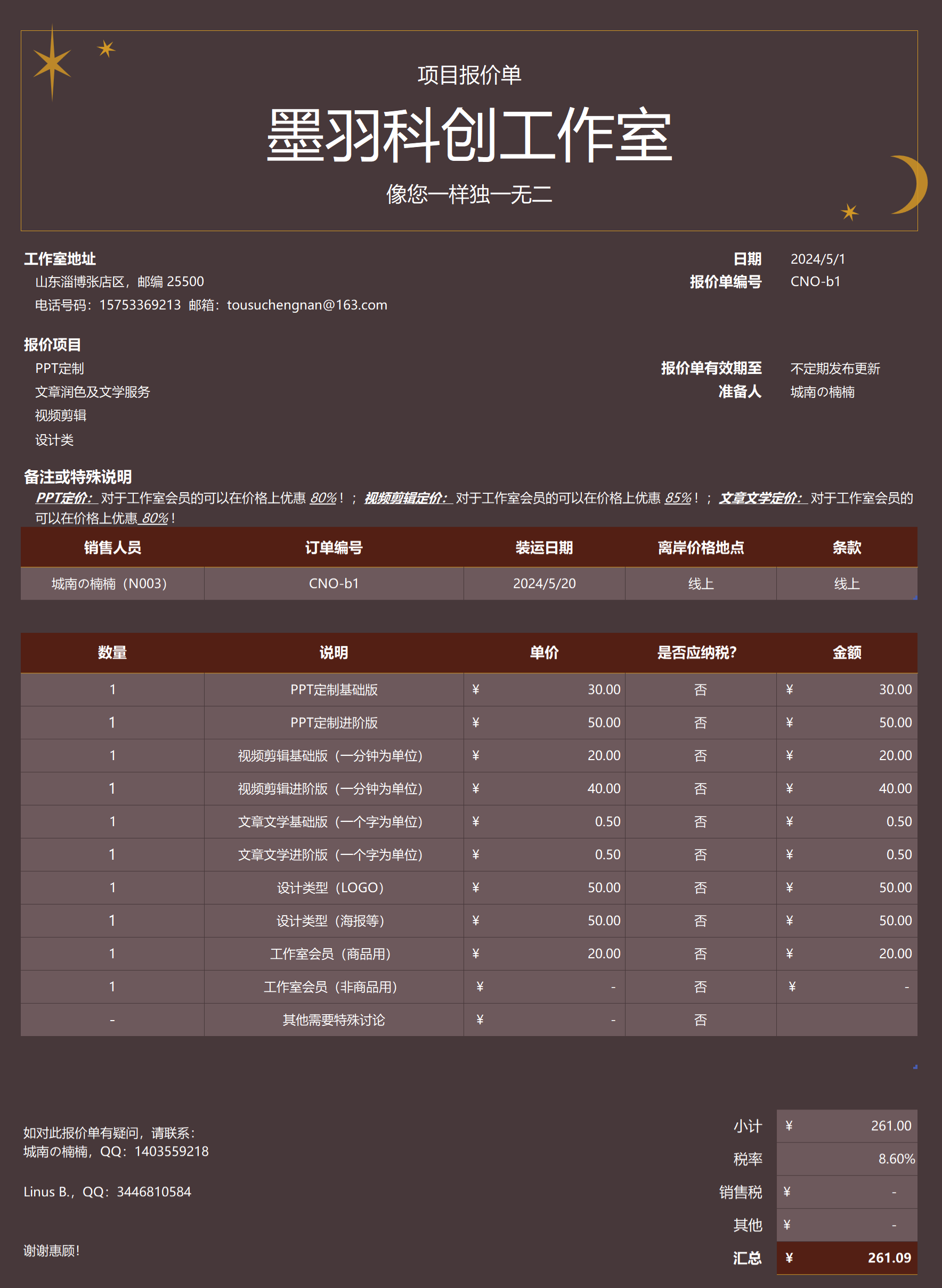 城南工作室,一站式满足您的各类需求。我们精心定制PPT,打动您的客户;提供文字润色,让文章文艺气息扑面而来;进行专业剪辑,让您的视频瞬间炫酷;严谨审核,为您的文章锦上添花;还提供编程服务,解决您的各类技术难题;我们的码字服务,专业且高效,为您节省宝贵时间。更多项目正在不断添加!选择城南工作室,让我们为您事半功倍!联系QQ:1403559218